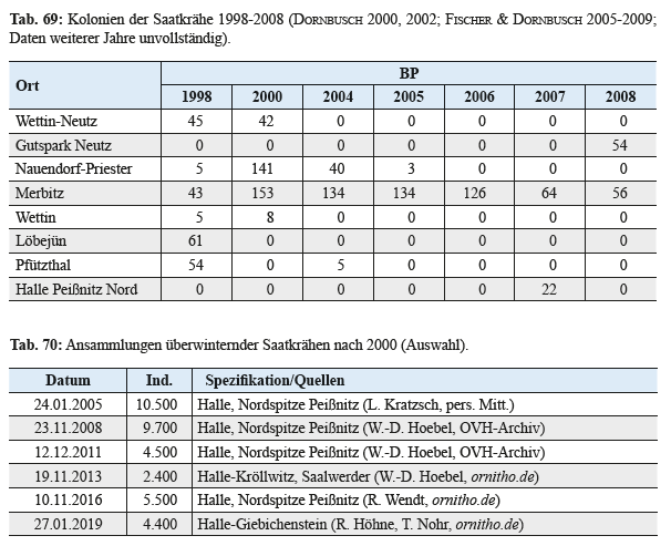 Ansammlungen in fünfstelliger Höhe, wie am 14.2.1999 – 36.000 Ind. an der Deponie Lochau (R. Höhne, George & Wadewitz 2000), gehören offenkundig der Vergangenheit an (Tab. 70). Bemerkenswert an der Beobachtung am 24.1.2005 von L. Kratzsch ist der Nachweis, dass die Vögel nicht, wie allgemein früher üblich, zum Schlafplatz auf der Rabeninsel wechselten, sondern direkt am Ort übernachteten. Die Peißnitz- Nordspitze wurde erstmals im Herbst 1997 als Schlafplatz für Saatkrähen nachgewiesen (L. Kratzsch, pers. Mitt.). In den Folgejahren nahm dessen Bedeutung zu, während auf der Rabeninsel immer weniger Überwinterer nächtigten.